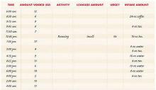This sample diary alone reveals that symptoms were due to excessive fluid and methylxanthine intake. This patient’s symptoms abated with decreased intake of water and tea.