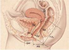 Nine sites—points Aa, Ba, C, D, Bp, and Ap; the genital hiatus (GH); the perineal body (PB); and total vaginal length (TVL)—are used to measure pelvic organ support. This drawing represents Stage 0 prolapse, as there is no descent of any of the vaginal compartments. Points Aa and Ap are always measured at the point exactly 3 cm from the reference point of the hymenal ring. Since there is no descent in this example, points Aa and Ap are both -3.