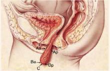 POPQ examination for a patient with vault prolapse after a hysterectomy. Notice how points Aa and Ap are now located outside the body, but are still exactly 3 cm from the hymen. The most distal part of the anterior wall (point Ba), the vaginal cuff (point C), and the most dis-tal part of the posterior wall (point Bp) are all at the same position.