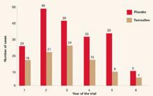 The rate of cancer reduction for tamoxifen compared with placebo for years 1 through 6 was 33%, 55%, 39%, 49%, 69%, and 55%, respectively.