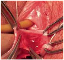 Anterior colporrhaphy traditionally is performed with plication of the “endopelvic fascia” or fibromuscular layer at the bladder neck with a Kelly plication stitch. Using “3-point” traction aids in dissecting the muscularis (FIGURE 4). Repair the remainder of the cystocele using vertical mattress stitches (1 or 2 layers) from the bladder neck to the apex.