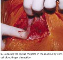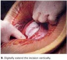 Digitally extend the transverse uterine incision. We extend the initial incision not laterally but, instead, vertically (FIGURE 3B). The vertical digital traction on the initial transverse uterine incision creates a transverse dissociation of the horizontal myometrium fibers; this results in a transverse extension of the original incision.