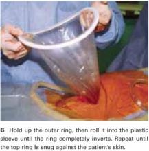 Hold up the outer ring, then roll the plastic sleeve until the ring completely inverts (FIGURE 2B). Repeat the process until the top ring is snug against the patient’s skin.