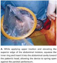 Squeeze the inner ring and insert it into the abdominal cavity toward the patient’s head, allowing the device to spring open against the parietal peritoneum (FIGURE 2A). Apply upper traction and elevate the superior edge of the abdominal incision to facilitate placement. Perform a digital check to ensure no tissue is trapped between the inner ring and the abdominal wall.
