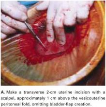 Make a transverse 2-cm uterine incision with a scalpel, approximately 1 cm above the vesicouterine peritoneal fold (identify this using gentle digital pressure to elevate the uterus) (FIGURE 3A).