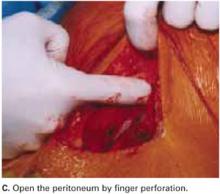 Introduce a hand through the laparotomy incision and evaluate the pelvis to ensure that no significant adhesions are present that may interfere with swift placement of the inner ring. If significant adhesions are found, use traditional metal retractors instead.