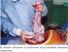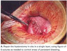 Use a single-layer closure with a running suture of polyglycolic acid to close the uterine incision (FIGURE 5A). If needed, use atraumatic clamps to grasp the edges of the hysterotomy to facilitate visualization and closure.