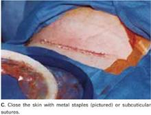 Close the skin using a subcuticular continuous absorbable 4-0 suture or, alternatively, metal staples, which are removed 4 days after surgery (FIGURE 5C).