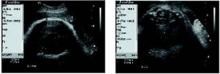 A simple way to predict fetal macrosomia in women with diabetes is to subtract the fetal biparietal diameter (9.3 cm in the scan at left) from the abdominal diameter (average of 12.44 cm in the scan at right). If the difference exceeds 2.6 cm, elective cesarean is warranted. In this case it is 3.14 cm, indicating elective cesarean is warranted.