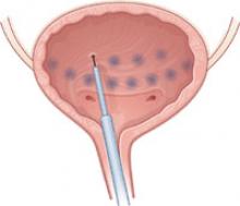 Interest continues to rise in treating detrusor overactivity—with or without incontinence—with botulinum toxin A. Only one commercial product is available in the United States, sold by Allergan under the trade name Botox. Last year, the Pelvic Floor Disorders Network, sponsored by the National Institute of Child Health and Human Development and the Office of Research in Women’s Health, began a placebo-controlled trial of cystoscopic detrusor injection of 200 U of Botox versus placebo, randomized in a 2:1 ratio, for women with incontinence caused by refractory idiopathic detrusor overactivity (FIGURE 2).