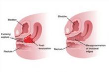 The septum is resected from the distal vagina. This is followed by end-to-end anastomosis of mucosal edges.