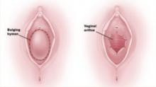 Bulging hymen due to mucocolpos in a newborn (top) and hematocolpos in an adolescent (bottom).