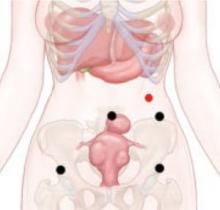 This entry site (red dot) lies midway between the midclavicular line and the anterior axillary line, 3 cm below the costal margin. The other port sites (black dots) are described in Figure 2 in Part 1 of this article.