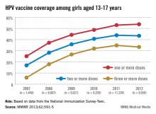 In 2011, only 35% of girls aged 13-17 years had received the full three doses of the HPV vaccine, which dropped slightly in 2012, which is "a huge disappointment," Dr. Frieden said during a July 25 telebriefing. The proportion of adolescent girls who received at least one, two, and the full three-dose HPV vaccine series increased every year from 2007 to 2011, but stalled between 2011 and 2012 and remains at unacceptably low levels – while missed opportunities for vaccination in this population have increased markedly, according to the data (MMWR 2013;62:591-5).