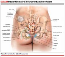The InterStim procedure is the only therapeutic modality to include a test phase. The outpatient procedure involves sterile placement of an electrode through the S3 foramen to stimulate the S3 nerve root using fluoroscopic guidance (FIGURES 2 and 3). Patients who experience at least 50% improvement in symptoms are then offered placement of a permanent stimulator.