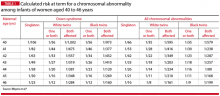 Maternal age-related risks of autosomal trisomies (especially Down syndrome) are well understood and have been quantified for singleton and twin gestations. TABLE 1 shows the risks at term for singleton and twin gestations for at least one chromosomally abnormal fetus by maternal age (40–46 years) and race.7