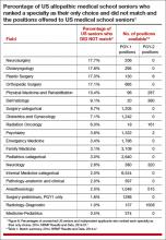 When researching for this editorial, I consulted the National Resident Matching Program’s Results and Data 2014 Main Residency Match.1 The TABLE shows the percentage of US medical school seniors who ranked a specialty as their only choice and did not match. The fields of neurosurgery, otolaryngology, plastic surgery, and orthopedic surgery had the greatest number of US medical school seniors (more than 17%) who ranked a specialty as their only choice and did not match in 2014. The fields of physical medicine and rehabilitation, dermatology, general surgery-categorical, obstetrics and gynecology, and radiation oncology had 6% to 11% of US seniors who ranked a specialty as their only choice not match in 2014. By contrast, almost all US applicants successfully matched in the fields of medicine-pediatrics, diagnostic radiology, anesthesiology, pathology, internal medicine-categorical, neurology, pediatrics-categorical, family medicine, emergency medicine, and psychiatry.