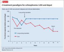 Relapses begin within a few months of illness stabilization after FEP, and >50% of patients relapse within 1 or 2 years2—the recommended minimum treatment duration for FEP.8,9,13 The use of LAIA is advisable in any patient with schizophrenia for whom long-term antipsychotic therapy is indicated.56 LAIA administration requirements objectively track medication adherence, which allows clinicians to be proactive in relapse prevention. Not using an intervention in FEP that improves adherence and decreases relapse rates contradicts our goal of instituting early, effective treatment to improve long-term functional outcomes (Figure 2).29