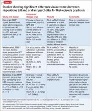 Preliminary evidence. At least a dozen studies have explored LAIA treatment for FEP, with the use of fluphenazine decanoate,36 perphenazine enanthate37 (discontinued), and risperidone microspheres.37-48 The research demonstrates the efficacy and safety of LAIA in FEP as measured by these endpoints: • improved symptom control38,40-43,46,48 • adherence43,44,48 • reduced relapse rates37,43 and rehospitalizations37,47 • lesser reductions in white matter brain volume45 • no differences in extrapyramidal side effects or prolactin-associated adverse effects.48