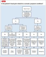 In addition to using the AMPS approach for psychiatric assessment, clinicians should evaluate for somatization, which can present as head pain. Somatic symptom disorders (SSD) are a class of conditions that are impacted by affective, cognitive, and reinforcing factors that might or might not be consciously or intentionally produced. Patients with an SSD have somatic symptoms that are distressing or cause significant disruption of daily life because of excessive thoughts, feelings, or behaviors related to the somatic symptoms, for ≥6 months. The Figure outlines SSD, related conditions, and their respective prominent symptoms to assist in the differential diagnosis.26