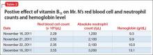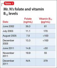 We suspected that Mr. N’s vitamin B12 deficiency could have been affecting his mental status; consequently, we ordered routine laboratory work-up that included a complete blood count with differential and peripheral smear, which showed macrocytic anemia and ovalocytes. We also tested his vitamin B12 level, which was very low at 55 pg/mL. These results, combined with his previously recorded vitamin B12 level (Table 1), suggested deficiency.