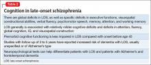 The presence of cognitive deficits in schizophrenia is common and well-recognized. The intellectual impairment is generalized and global, and there also is specific impairment in a range of cognitive functions, such as executive functions, memory, psychomotor speed, attention, and social cognition.5 Typically these cognitive impairments are present before onset of psychotic symptoms. Although cognitive symptoms are not part of the formal diagnostic criteria, DSM-5 acknowledges their presence.3 In a systematic review on nature and course of cognitive function in LOS, Rajji and Mulsant6 report that global deficits and specific deficits in executive functions, visuospatial constructional abilities, verbal fluency, and psychomotor speech have been found consistently in studies of LOS, although the presence of deficits in memory, attention, and working memory has been less consistent.