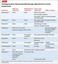 No significant pharmacokinetic changes with duloxetine have been noted in patients with mild or moderate renal impairment.22 However, duloxetine’s major metabolites, which are excreted renally, have been measured to be as much as 7 to 9 times higher in patients with ESRD compared with healthy subjects; therefore, it is recommended to avoid duloxetine in patients with severe renal disease.4,22 Our review of the literature produced limited recommendations on dosing milnacipran and its enantiomer levomilnacipran in renally impaired patients. The milnacipran package insert cautions its use in moderate renal impairment and recommends a 50% dosage reduction to 100 mg/d (50 mg twice daily) in patients with severe renal impairment.23 Dosage recommendations for levomilnacipran are 80 mg/d for moderate renal impairment and 40 mg/d for severe impairment. Both agents have relative contraindications for ESRD.23,24