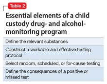 If the evaluation determines a monitoring plan is indicated and the court orders a testing program, the evaluator must design a program that accomplishes the specific goals established by the court order. The evaluator might help the court draft that plan, but the evaluator must accommodate the final court order. Table 2 lists vital aspects of a monitoring program in a child custody dispute.