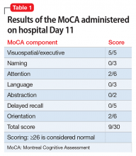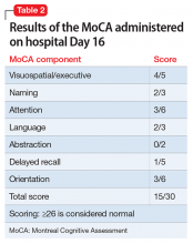 The Montreal Cognitive Assessment (MoCA) is administered on hospital Day 11 and indicates that Mr. F’s cognitive ability is severely impaired (Table 1). Over the next several days, his affect brightens, and Mr. F becomes more talkative and less withdrawn. With additional caloric intake and dietary supplements, he begins to regain weight. The MoCA is administered again on hospital Day 16 and shows significant neurocognitive improvement in organization of thought (as evidenced by the increased scores in naming, language, and orientation); however, moderate impairment is still present (Table 2).By hospital Day 20, Mr. F’s hallucinations are resolved, his delusions are greatly attenuated, and his mood is improved. Although his cognition is still mildly impaired, it is greatly improved compared with when he was first admitted. A third MoCA administered on the day of discharge (hospital Day 24) is scored at 21/30 (≥26 is considered normal). Mr. F has become more socially interactive, participating in group therapy sessions on multiple occasions. He also has improved insight into his illness, understanding the need for medication and close follow-up.Mr. F is discharged with risperidone, 2 mg twice daily, for schizophrenia, fluoxetine, 20 mg/d, for depression, and trazodone, 50 mg, as needed, for sleep, and is referred to a community mental health center for comprehensive follow-up, including vocational rehabilitation and social skills training.
