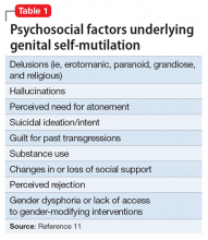 There are numerous psychological factors underlying and engendered by GSM.18-22 Delusions, hallucinations, a need for atonement, suicidal ideation, and subjective guilt have been reported among individuals engaging in GSM who have psychosis (Table 1).11 Severe forms of GSM, such as castration, occur among individuals who manifest more symptoms and greater severity of psychopathology.Little is known about how many individuals who engage in GSM eventually complete suicide. Although suicidal ideation and intent have been infrequently associated with GSM, suicide has been most notably reported among patients with schizophrenia spectrum disorders and psychotic mood disorders.11,18,23-26 For these individuals, suicidal ideation co-occurred with delusions, hallucinations, and pathological guilt preoccupations. Significant self-inflicted injury can be harbinger of distress that could lead to suicide if not optimally treated. Other psychosocial stressors, such as disruptions in interpersonal functioning arising from changes in or loss of social support or perceived rejection, may contribute to a patient’s level of distress, complicating underlying psychiatric disturbances and increasing vulnerability toward GSM.11,27