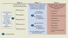 Source: Reference 2.Medications. Three atypicals—risperidone, olanzapine, and quetiapine—were approved for schizophrenia when the trial began in 1999. Recruitment ended in June 2003, the last subject completed the 18-month trial in December 2004, and data analysis began in January 2005. Ziprasidone was added to phase 1 after 40% of the sample had been enrolled, and aripiprazole was included as an option in the unblinded phase 3.