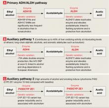 Genetic variations affect the efficiency of primary and auxiliary pathways by which ethyl alcohol is metabolized to acetaldehyde and acetic acid. Auxiliary pathways become involved when the primary pathway is overwhelmed by the amount of alcohol to be metabolized.