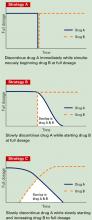 Abruptly discontinuing an agent is less confusing and more convenient than gradual tapering, but patients may experience acute withdrawal (as with clozapine). Finally, no guidelines exist on how quickly to make the transition when one or both medications are cross-titrated and tapered. For inpatients receiving intense monitoring, a transition may be completed in 3 to 7 days, whereas outpatients may require 1 to 3 weeks.