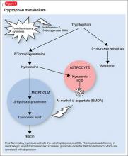 Proinflammatory cytokines activate theextrahepatic enzyme indoleamine 2,3-dioxygenase (IDO), which degrades tryptophan, a precursor to serotonin (Figure 1). Tryptophan is channeled increasingly toward production of kynurenine via IDO degradation, competing with the serotonin pathway. Within the microglia, which are preferentially activated over astrocytes during inflammatory states, kynurenine is metabolized into quinolinic acid, which is an agonist of glutamatergic NMDA receptors.28 Therefore, there is a serotonergic deficiency and glutamatergic overdrive in proinflammatory states that paves the way toward a likely depressive syndrome (Figure 2).
