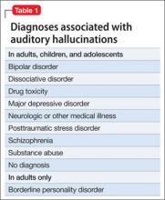 Among adults in the general population, 10% to 15% report auditory hallucinations.6 Hallucinations could be caused by substance abuse or psychiatric conditions other than schizophrenia; however, in adults—as in children—auditory hallucinations can occur in the absence of these conditions (Table 1) and rarely cause distress or dysfunction.6 In Sommer and colleagues’6 study of 103 healthy persons, none who heard voices had disorganization or negative symptoms. Those who heard voices had significantly more schizotypal symptoms and more childhood trauma, including emotional, physical, and sexual abuse, than those who did not hear voices.6
