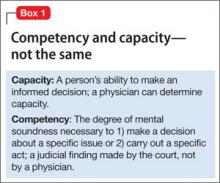 The most common reason for a capacity evaluation is a patient’s refusal of medical treatment. Between 3% and 25% of requests for psychiatric consultation in hospital settings involve questions about patients’ competence to make a treatment-related decision.3 Approximately 25% of adult medicine inpatients lack capacity for medical decision-making.4