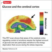 Hormones released from the adrenal glands during stress divert glucose to exercising muscles and the brain’s limbic system, which are involved in the fight-or-flight response.18 However, metabolic functions and areas of the brain that are not involved in the stress response, such as the cerebral cortex and hippocampus, are deprived of energy as a consequence of this innate selective shunting (Figure 2).19