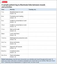 Although no specific technique defines CBT, a common practice is to educate a person about interrelationships between behaviors/activities, thoughts, and mood. A mood activity log (Figure 2) can illuminate links between moods and activities and be useful with targeting interventions. For a person with social anxiety, for example, a mood activity log could assist in developing a hierarchy of feared social situations and avoidance intensity. Systematic exposure therapy would follow, beginning with the least frightening/intense situation, accompanied by teaching new coping skills (such as relaxation strategies).