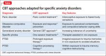 Elements of CBT have been adapted for a variety of anxiety disorders, based on specific symptoms and features (Table).10-15