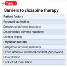 In 2008, clozapine accounted for only 4.4% of antipsychotic prescriptions in the United States.3 In our state forensic facility, only 10% of patients on an antipsychotic received clozapine in 2011. Despite the CATIE trial, there were no significant increases in clozapine prescribing after the results were published4 and patients often experience a substantial delay before clozapine is initiated.5 In the last several years, we have looked at methods to increase clozapine use in our hospital and have described some of our experiences. Despite enthusiasm for, and good experience with, clozapine, barriers limit the use of this medication (Table 1). One significant barrier is patient acceptance. Although most of our patients taking an atypical antipsychotic will accept a blood draws every 6 months for metabolic monitoring, many will reject clozapine because of the initial weekly blood draw. Other patients will reject a trial of clozapine because of fears of serious adverse reactions.