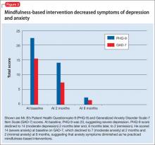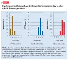 We consider MBI for Mr. B, which was developed by Segal et al7 to help prevent relapse of depression and gain the benefits of MM. There is evidence that MBI can prevent relapse of SUDs.12 Mr. B’s MBI practice is based on MBCT, as outlined by Segal et al.7 He attends biweekly, 45-minute therapy sessions at our outpatient clinic. During these sessions, MM is practiced for 10 minutes under a psychiatrist’s supervision. The MBCT manual calls for 45 minutes of MM practice but, during the 10-minute session, we instruct Mr. B to independently practice MM at home. Mr. B is assessed for relapses, and drug cravings; a urine toxicology screen is performed every 6 months.