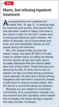However, some manic patients, in spite of their elevated, expansive, or irritable mood state, never behave dangerously and might not meet legal criteria for involuntary hospitalization, although these criteria differ from state to state. These patients might see a psychiatrist because manic symptoms such as irritability, talkativeness, and impulsivity are bothersome to their family members but pose no serious danger (Box). In this situation, the psychiatrist can strongly encourage the patient to seek voluntary hospitalization or attend a partial hospitalization program. If the patient declines, the psychiatrist is left with 2 choices: initiate treatment in the outpatient setting or refuse to treat the patient and refer to another provider.