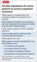 In exchange for agreeing to provide outpatient care for mania, it often is helpful to negotiate with the patient and family a threshold level of symptoms or behavior that will result in the patient agreeing to voluntary hospitalization (Table 1). Such an agreement can include stopping outpatient treatment if the patient does not improve significantly after 2 or 3 weeks or develops psychotic symptoms. The negotiation also can include partial hospitalization as an option, so long as the patient’s mania continues to be non-dangerous.