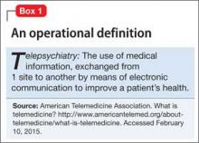 Too few psychiatrists. A growing number of patients. A new federal law, technological advances, and a generational shift in the way people communicate. Add them together and you have the perfect environment for telepsychiatry—the remote practice of psychiatry by means of telemedicine—to take root (Box 1). Although telepsychiatry has, in various forms, been around since the 1950s,1 only recently has it expanded into almost all areas of psychiatric practice.