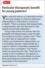 Pediatric psychiatry. The literature shows that children, families, and clinicians are, on the whole, satisfied with telepsychiatry.5 Children and adolescents who have been shown to benefit from telepsychiatry include those with depression,6 posttraumatic stress disorder, and eating disorders.7 Based on a case series, some authors have asserted that telepsychiatry might be preferable to in-person treatment (Box 2).8