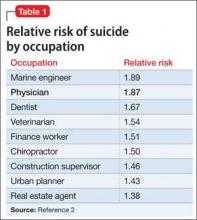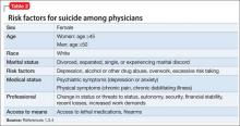 Physicians and other health professional have a higher relative risk of suicide (Table 1).2 Hospitalization should be considered and the decision based on the severity of the illness and the associated risk. Dr. D has several risk factors for suicide, including marital discord, pain, professional demands, and access to lethal means (Table 2).1,3,4