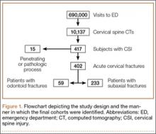 Radiology reports for all identified CT scans were reviewed for any findings consistent with acute fractures and/or dislocations of the cervical spine (Figure 1). Every study noted to be positive or equivocal for cervical trauma was directly visualized, including those that did not specifically mention the presence or absence of an injury. Scans with no signs of acute trauma or that showed fractures caused by a pathologic process or penetrating mechanism (eg, metastatic lesions or gunshot wounds) were omitted from this series. Finally, relevant demographic information, such as the medical record number, age, gender, and date of study, was recorded for every subject in this group.