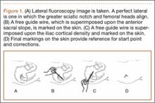 To our knowledge, the most common image-based technique used to guide start-point localization and placement of SI screws begins with drawing a virtual sacrum on the patient’s side using the lateral image. The fluoroscopic machine is set up in a lateral position.5 A free guide wire is superimposed upon the iliac cortical density and anterior sacral slope, which is marked on the skin (Figure 1). The superior portion of S1, as well as the posterior sacral slope, can be marked as well. This process has outlined the sacrum and provides an external landmark for the “safe zone” for screw placement. The operation proceeds in the standard fashion using inlet, outlet, and lateral radiographs. However, the externally drawn sacrum can aid as a reference during guide-pin placement.