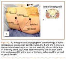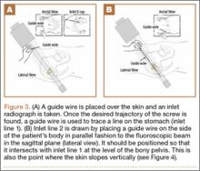 To begin, a standard cannulated screw guide wire is placed flush on the skin of the abdomen. An inlet fluoroscopy image is taken with the guide pin on the abdomen. Imagine that the resulting image represents the planned screw trajectory (Figure 3A). When the position of the guide wire is deemed adequate, a line is marked on the abdomen, using a pen, directly adjacent to the guide wire. This line represents inlet line 1 (Figure 2). The line must continue laterally until the down-sloping point. The sagittal angle of the imaginary inlet fluoroscopic beam is noted, and a guide wire is placed in the same sagittal orientation flush with the skin on the lateral buttock (Figure 3B). The guide wire must be placed so that it intersects with the first line at the down-sloping point. The skin on the lateral aspect of buttock is marked with a second line, which represents inlet line 2 (Figure 2).