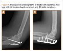 Olecranon fractures are a common injury, representing 10% of all upper extremity fractures.1 Displaced fractures require fixation to restore anatomical alignment and minimize posttraumatic arthrosis.2,3 Multiple surgical techniques have been developed to treat these fractures, with implant choice largely dictated by fracture pattern and associated injuries. Simple, noncomminuted, transverse, proximal fractures can be treated with a tension-band construct, and fractures that are comminuted, oblique, distal to the midpoint of the sigmoid notch, or associated with complex elbow injuries generally require locking-plate fixation.4,5 Although both tension bands and locking plates have been used successfully (Figures 1A, 1B), they remain some of the most frequently removed orthopedic implants, usually because of implant prominence.6